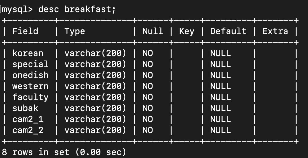 sql_b = 'INSERT INTO breakfast(korean, special, onedish, western ,faculty ,subak ,cam2_1 ,cam2_2) VALUES(%s, %s, %s, %s, %s, %s, %s, %s)'